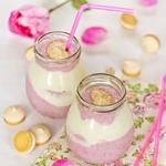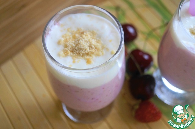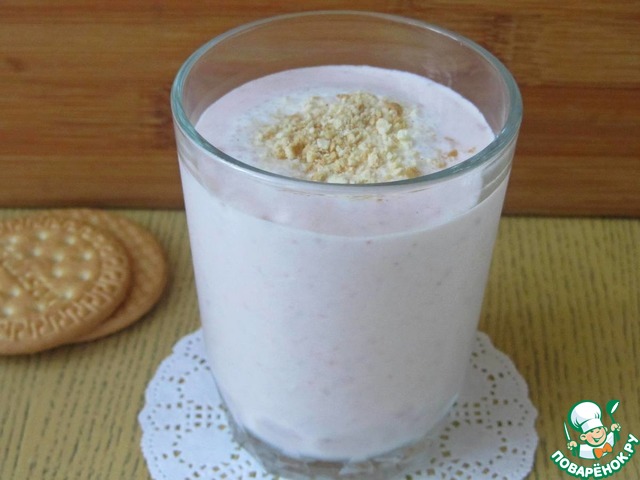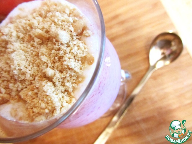 В бокалы налить клубничный смузи и аккуратно ложечкой влить сверху ванильный смузи. Сверху украсить крошкой печенья. -