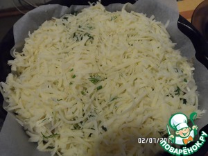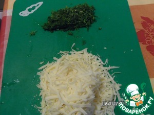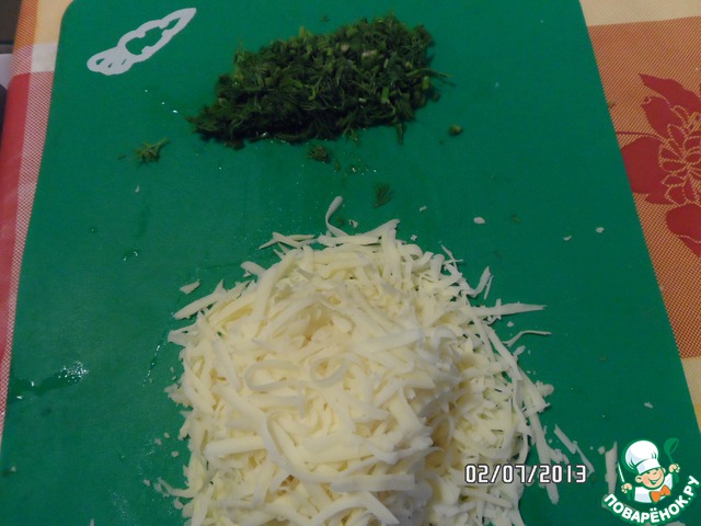 Нарезать зелень, я брала укроп, натереть сулугуни.
