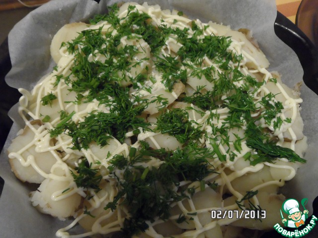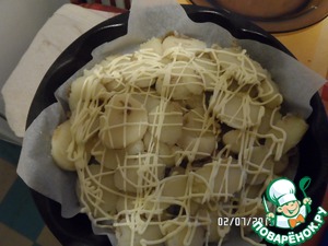 Картофель порезать кружочками и уложить в форму для запекания, сделать майонезную решетку.