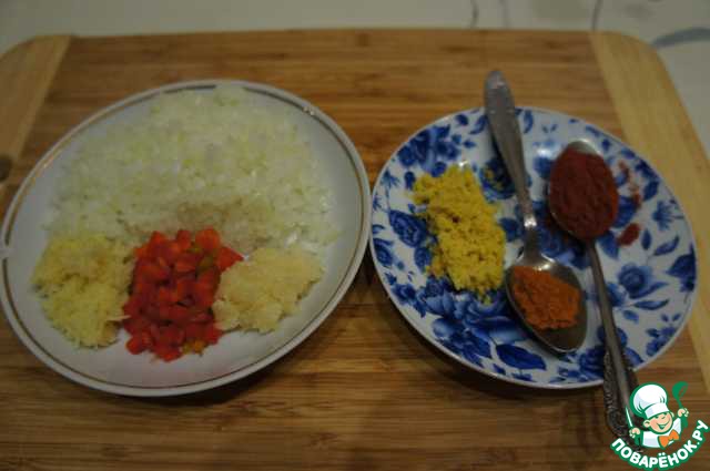 • У свежего перца чили удалить семена и мелко нарезать. Лук измельчить. Имбирь натереть на терке. Чеснок выдавить через пресс.