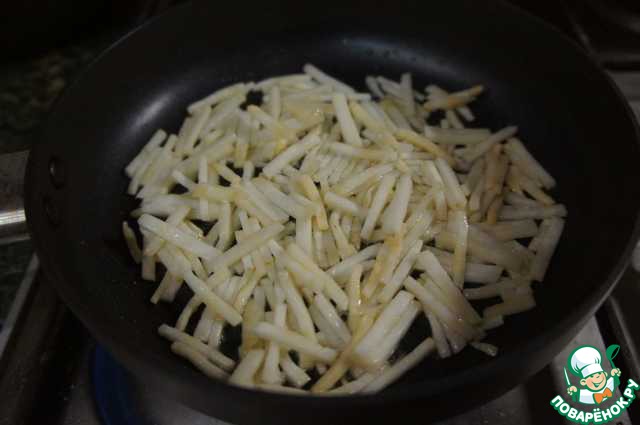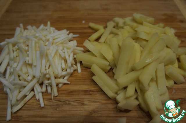 • Сельдерей нашинковать соломкой. Картофель нарезать брусочками.