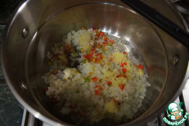 • В кастрюле разогреть растительное масло. Добавить лук, чеснок, свежий перец чили и имбирь. Обжаривать, помешивая, до мягкости лука.