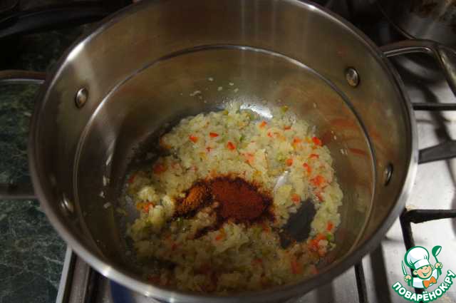 • Добавить молотые специи, обжарить все вместе 1 минуту.