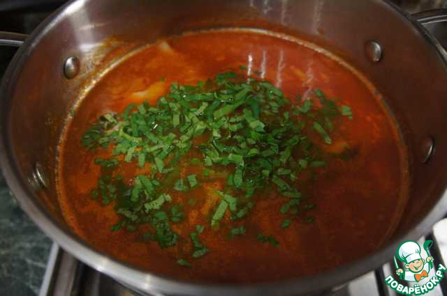 • Снять суп с огня, добавить половину зелени кинзы и накрыть крышкой. Оставить настаиваться 5 минут.