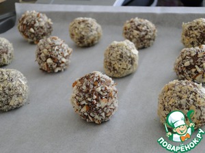 Через 40 минут достать из холодильника. Брать по 2/3 столовой ложки смеси и скатывать между ладонями шарики (около 14 штук).