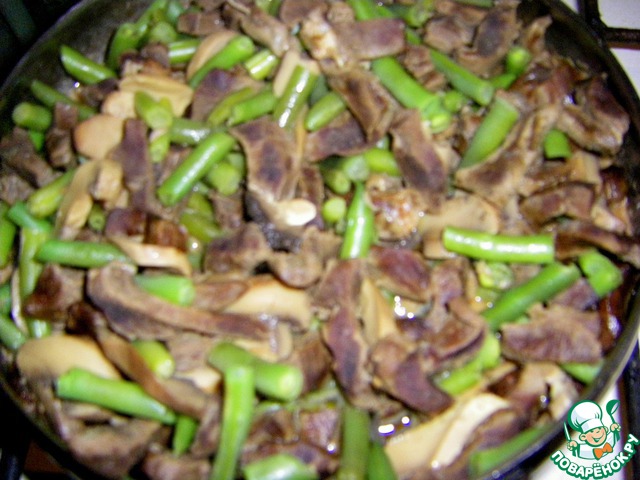 • Из мяса выпариваем лишнюю жидкость (можно просто слить). Смешиваем мясо с соусом.