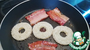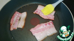 Режем грудинку или бекон на пластины и обжариваем на большом огне 1 мин с двух сторон.