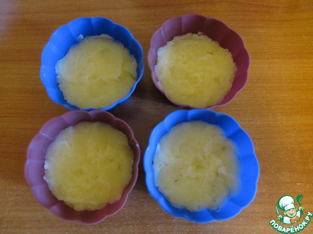 В формочки для кексов выкладываем картофельное пюре (наполняем до половины).