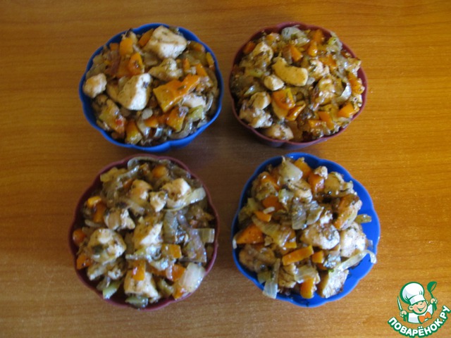 Нарезать лук полукольцами, куриное филе, морковь и болгарский перец кубиками. Обжарить все на подсолнечном масле, с добавление зелени, соли и перца до готовности.