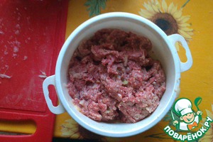 У меня под рукой не оказалось куриного фарша, поэтому я взяла домашний. Кладем в миску фарш, добавляем яйцо, соль и натертые на крупную терку яблоко и лук.