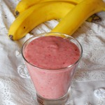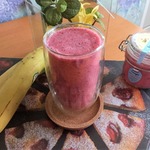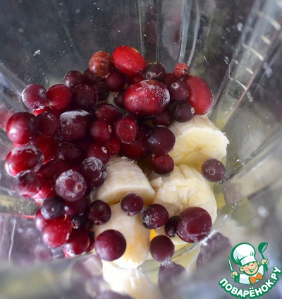 В блендер нарезать банан, положить замороженную клюкву. Влить сок.
