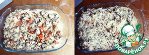 -Сверху выложить четверть соуса бешамель и всё посыпать сыром - его лучше тереть на мелкой тёрке!
