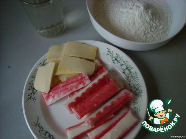 Из муки и воды замесить тесто. Разделить на шарики, раскатать, на каждый шарик положить по целой палочке и кусочек сыра, защипать и жарить на раскаленном масле.