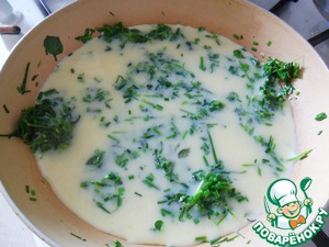 Яйца взбить с молоком вилкой, добавить соль и перчик и влить на сковороду к зелени. Когда масса уплотнится - все готово!