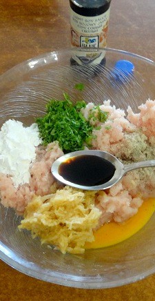 Смешать, фарш, яблоко, мелко нарезанную петрушку, яйцо, крахмал, душистый перец, соевый соус Blue Dragon и по желанию чеснок, пропущенный через пресс.