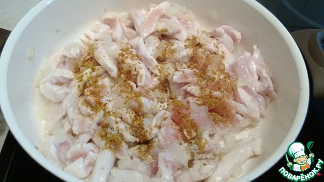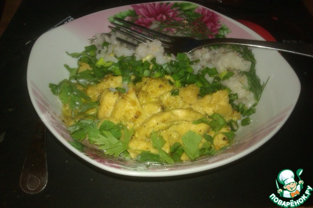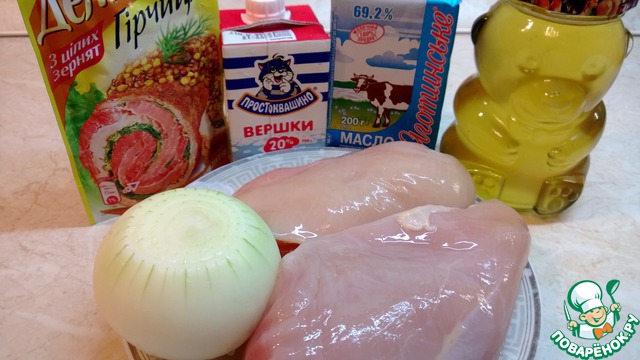 • Продукты: куриная грудка, сливки 20% мед, лук, горчица французская, карри, сливочное масло.