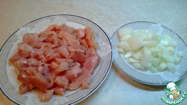 • Порезать лук кубиками. Куриное филе порезать, как на бефстроганов, тонкими полосками.