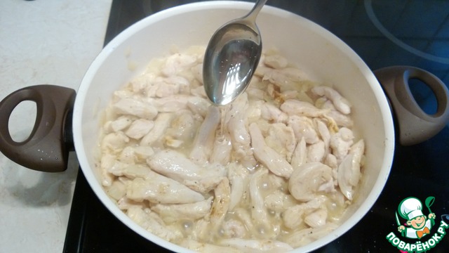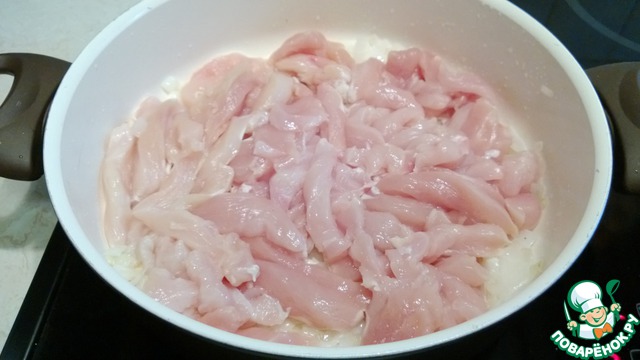 • Ставим огонь на максимум и добавляем куриные грудки для обжарки.