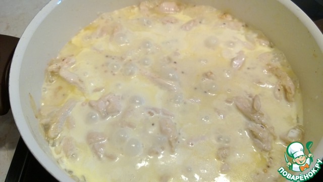 • Вливаем сливки, убавляем огонь на среднюю температуру и тушим еще 5-7 минут. Все, наше блюдо готово.