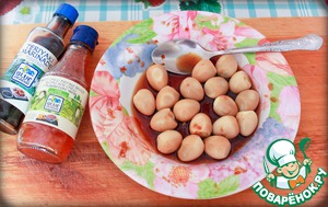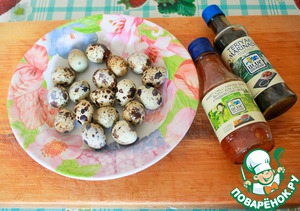 Яйца очищаем, кладём в подходящую ёмкость, добавляем маринад терияки (несколько столовых ложек) и сладкий чили по вкусу.