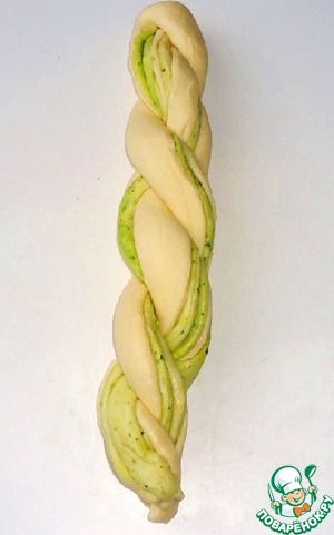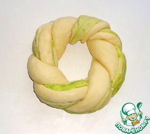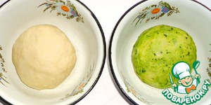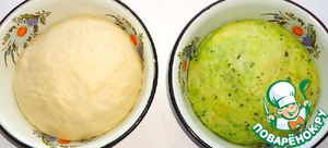 Тесто делим на 2 равные части и в одну добавляем измельченный шпинат вместе с соком. Тесто ставим в теплое место, не менее чем на 1 час.