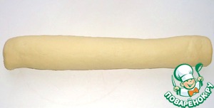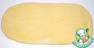 Сначала раскатываем светлое тесто в пласт длиной 35 см, шириной 15 см и толщиной 0,5 см, смазываем растопленным сливочным маслом.