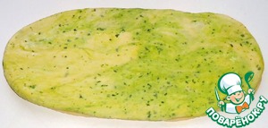 Затем раскатываем тесто со шпинатом в точно такой же пласт, как и светлый, кладем поверх светлого пласта и смазываем растопленным сливочным маслом.