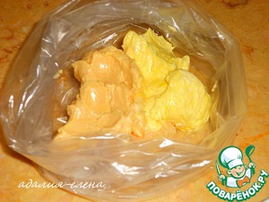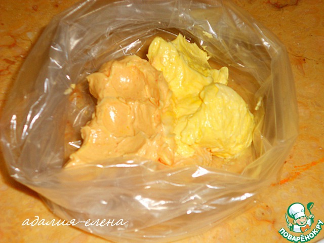 • Подготовить сливочный крем: взбить сливочное масло, сахарную пудру, ванилин и молоко. Лучше взбивать венчиком, это не займет много времени, примерно 5-7 минут, и крем приобретает перламутровый оттенок. По желанию крем можно слегка подкрасить желтым или оранжевым цветом. Так, как будто это огонь