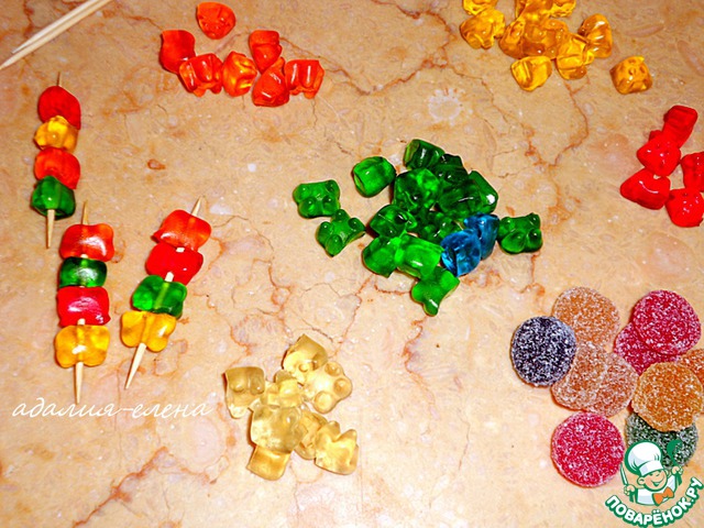 • Для барбекю желейные конфеты и мармелад нарезать маленькими кусочками. Чередуя цвета, нанизать конфеты на деревянные палочки.
