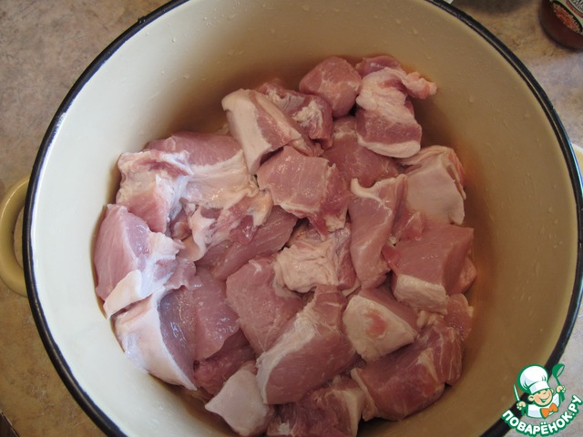 Первым делом помоем мясо. Для приготовления шашлыка я взяла свинину, а если быть точнее, то свиную шею весом 3 кг, небольшое количество жирка придает шашлыку сочность!