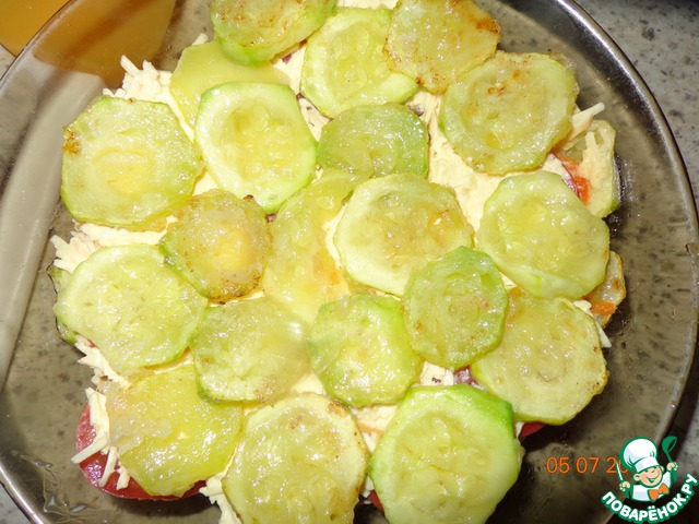 Собираем слоями: кабачки, прослойка из сыра с майонезом, лук с морковью, помидоры, снова слой сыра, опять кабачки, лук с морковью, сыр и т. д.