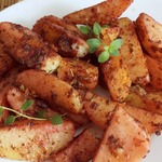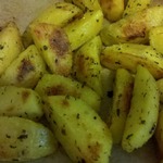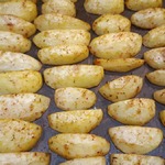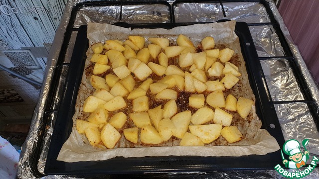 Выкладываем на лист картошку и поливаем сверху смесью масла и приправ. Ставим в духовку на 30 минут при 190*С