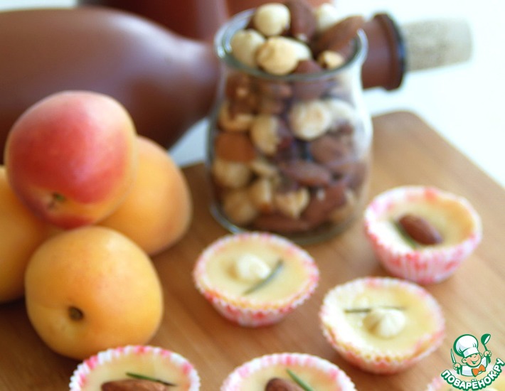 Выложить в бумажные формочки для конфет. Поставить на 10-15 секунд в СВЧ, лучше следите. Как только сыр начнет плавиться, достать из СВЧ, положить в серединку по ореху. Поставить в холодильник до полного остывания.