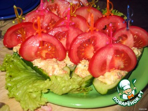• 3. уложить огурцы на листья салата, наполнить начинкой. разрезать пополам помидоры, нарезать тоненькие пластинки, из которых сформировать парус, укрепив его шпажкой или зубочисткой на огуречной лодочке