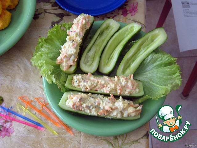 2.натереть на крупной терке яйцо и морковь, смешать с сырной массой, огурцы разрезать вдоль, вынуть серединку.