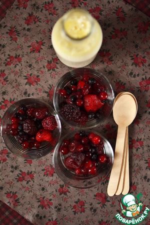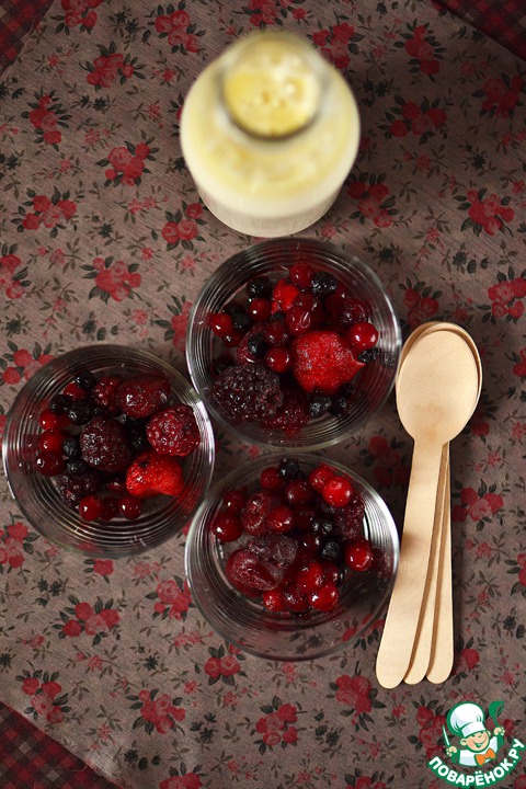 В каждый стакан всыпать равное количество замороженных ягод. Посыпать сверху сахаром.