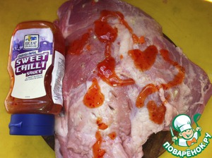 • Запекать в рукаве, сделав проколы зубочисткой сверху. Сначала ставлю максимальную температуру, затем, когда рукав "надуется" снижаю до 160 С. Запекаю примерно 1,5 часа до образования румяной корочки. Бывает, что корочка не образуется, тогда разрезаю рукав сверху и ставлю под гриль. Мясо получается сочное, ароматное, ближе к краю хорошо ощущается сладковато-острый вкус соуса чили от Blue Dragon.