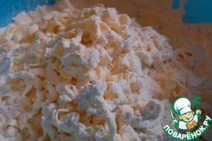 Муку перетереть с маслом. Проще сделать это, натерев масло на тёрке в муку, и руками растереть в крошку. В полученную крошку добавить разрыхлитель и перемешать.