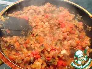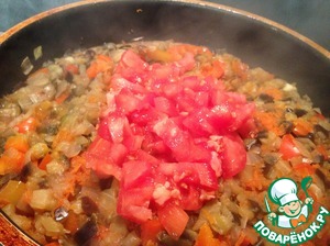 7. И последними идут помидоры. С них шкурку стоит снять. Некоторые предпочитают для этого кипятком обдавать. Но мне проще с усилием погладить ножом по поверхности помидора. Она от этого темнее становится и легко снимается. В любом случае режем помидорки, добавляем на сковороду и не забываем мешать. Солим, перчим, по желанию добавляем любимые специи и уменьшаем огонь.