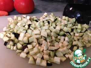 3. Пока лук готовится, мы беремся за баклажан. Можно его почистить, а можно, как я (когда тороплюсь), готовить нечищенным. Нарезать нужно его очень мелко.