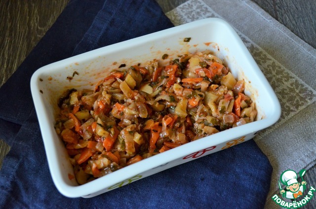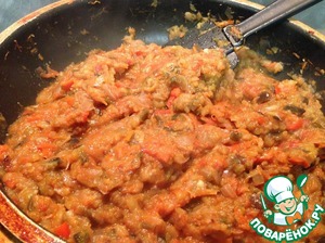 8. Мешать нужно часто, т. к. икра может легко пригореть. Тушим, пока овощи не станут мягкими, минут 5-10 (как на фото), затем мы берем толкушку и разминаем овощи в икру. Сока должно быть у вас и не очень много, но и не мало. Если много, то откройте крышку и поготовьте без нее.