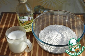 Постепенно вливаем оливковое масло и теплое молоко. Руками вымесить гладкое тесто. Сформировать шар, завернуть в пищевую пленку и поместить в холодильник на 1 час. -