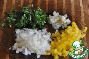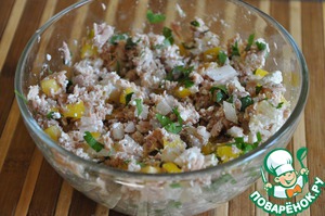 С тунца слить лишнюю жидкость, размять вилкой, добавить творог, нарезанные овощи. Солим, перчим.