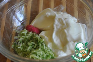 Для соуса трем на мелкой терке половинку огурца, добавляем йогурт и полчайной ложки хрена. Хорошо перемешиваем и убираем в холодильник, достаем уже к подаче. Соус получается очень вкусным, не сомневайтесь в составляющих)