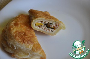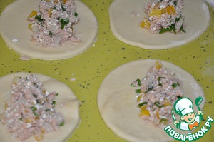 Достаем из холодильника тесто, тонко раскатываем, делаем кружки диаметром 10 см. Кладем начинку и придаем форму полумесяца.