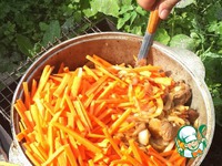 Закрываем крышкой, убираем огонь, поджигаем подготовленные лучинки и томим на очень маленьком огне около получаса. Готовность риса проверяйте не раньше, чем через 20 минут. Главное - не передержать, чтобы рис не разварился. Даже если на дне останется немного бульона, плов от этого будет только сочнее |
