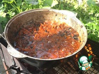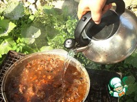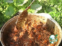 Добавляем стакан-два воды, должна быть консистенция густого супа, перемешиваем каждые 3-4 минуты, тушим 15 минут, не меньше |