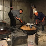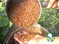 Наконец, очередь риса. Этот рис был привезен из ферганской долины и заботливо куплен нашем сегодняшним героем-кулинаром Сергеем заранее. Как он объяснил, выбор его пал именно на темный рис (хотя после промывания он сильно посветлел), из-за его высокого качества, но в принципе советует брать рис пропаренный, обязательно с темной полоской вдоль рисинки. Добавляем его в казан |