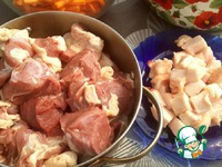 Курдючный жир вытапливаем до образования жировых "угольков", убираем шкварки, по стенкам казана проливаем немного хлопкового масла |