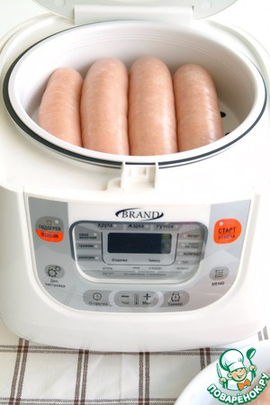 По истечении времени открыть мультиварку, чуть остудить сардельки.